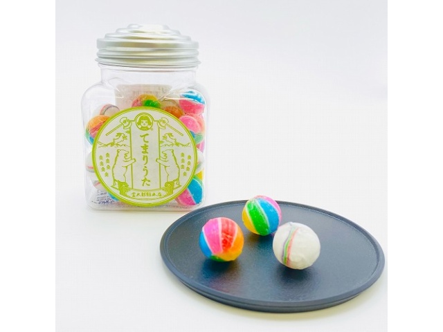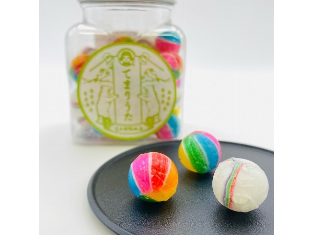 手鞠のようにカラフルで丸い飴を懐かしみのあるボトルに入れました。コロコロした見た目もかわいい飴です。